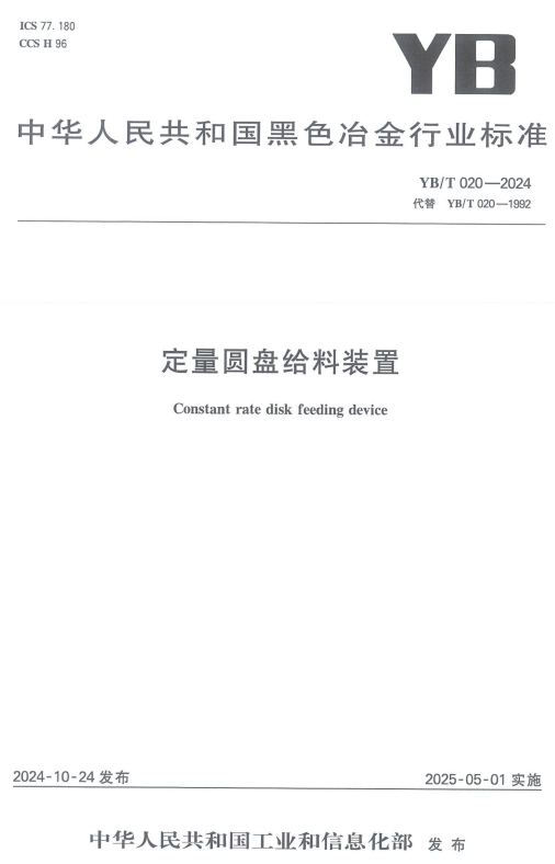 公司主導修訂的《YB/T 020-2024 定量圓盤給料裝置》行業(yè)標準正式發(fā)布